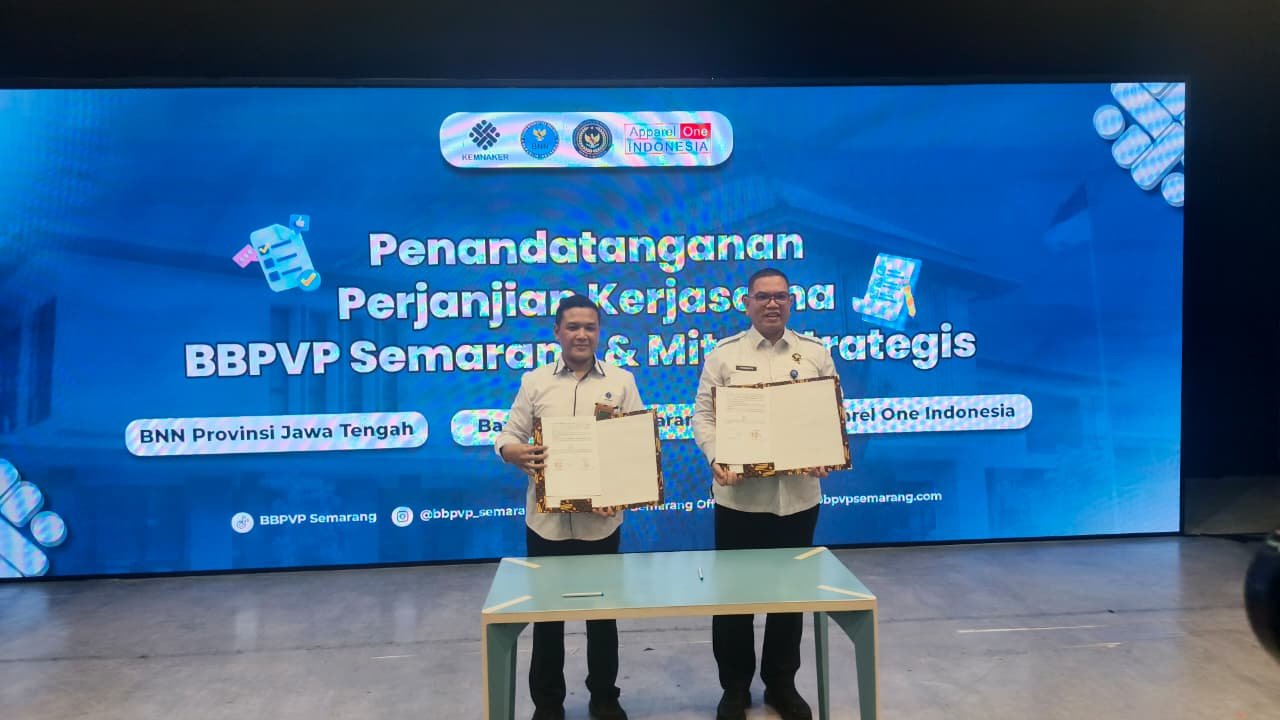 SEMARANG, MNNMEDIA.COM – BNNP Jateng bersama Balai Besar Pelatihan Vokasi dan Produktivitas (BBPVP) Semarang resmi menjalin kerja sama strategis melalui penandatanganan Perjanjian Kerja Sama (PKS) yang dilaksanakan di Ruang Fashion Show Stage BBPVP Semarang, Senin (13/4/2026).